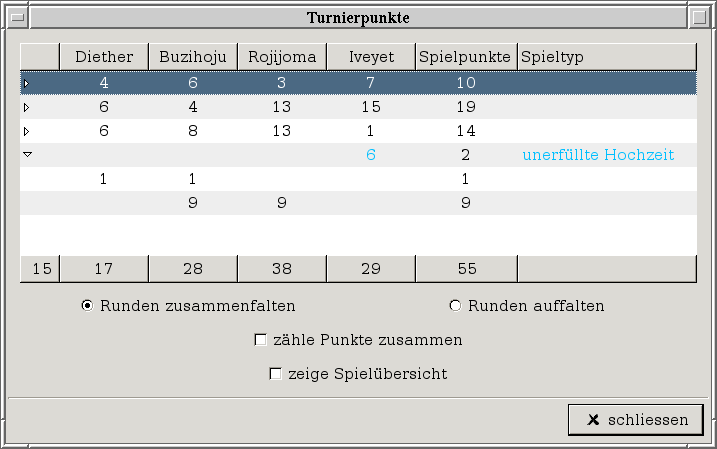 Der Hauptbestandteil des Turnierpunkte-Fensters ist die Liste mit den Punkten, die die Spieler in den Spielen erreicht haben. Dabei werden nur bei den Spielern Punkte hingeschrieben, die Punkte bekommen haben. Die Zählweise wird in den Regeln eingestellt.