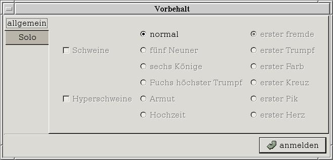 Als erstes bei einem neuen Spiel muß der Vorbehalt ausgewählt werden. Im Gegensatz zu dem Doppelkopf-Turnierregeln wird der Vorbehalt (bisher) ohne die Informationen, welcher Spieler sonst noch einen Vorbehalt angekündigt hat, ausgewählt.